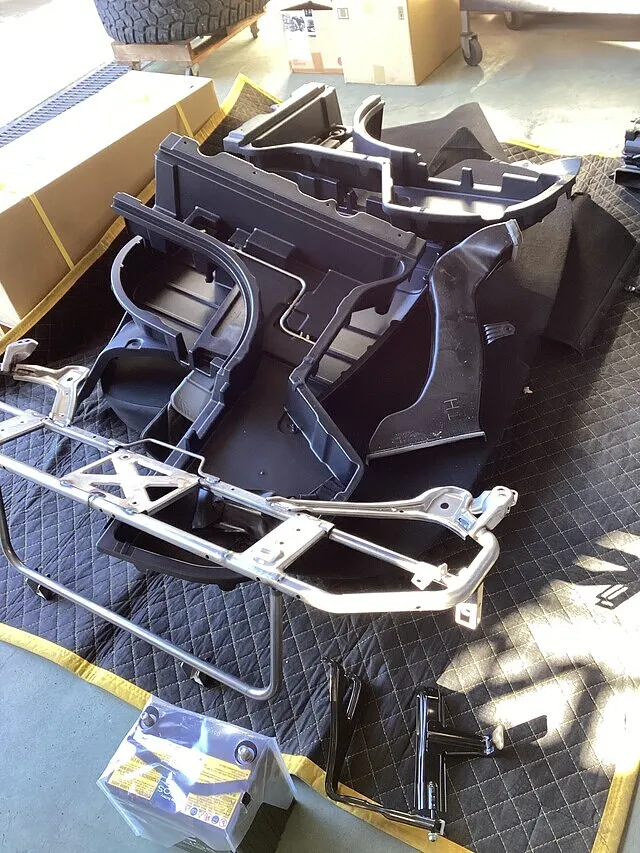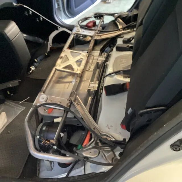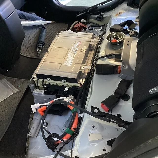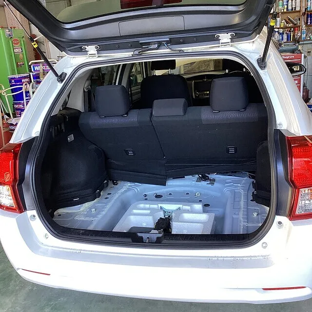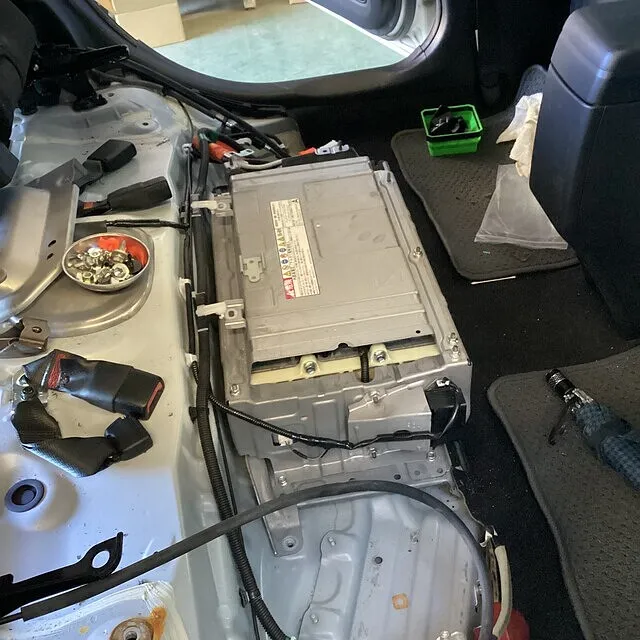 リアシートを取り外すために内装パーツと補機バッテリーを取り外しました。