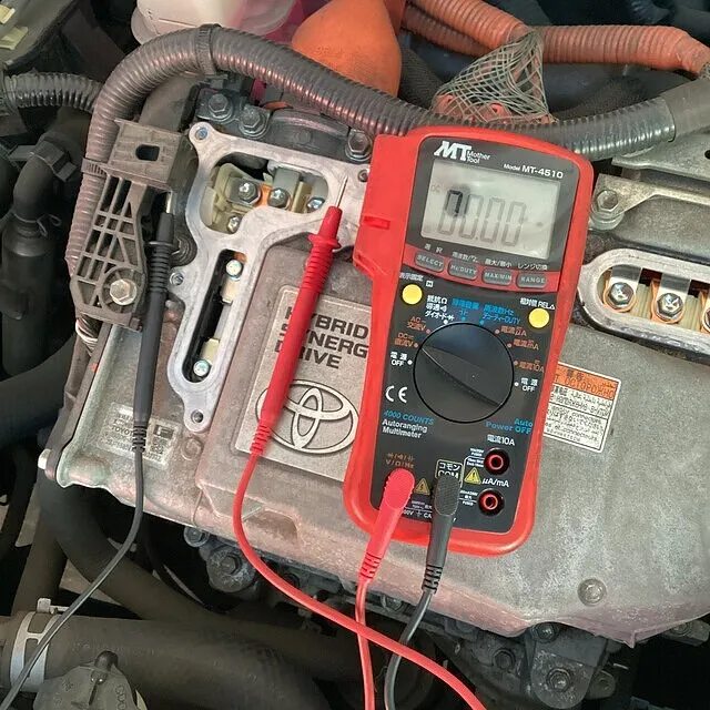 エンジンルームのインバータ部分で高電圧系統の0ボルト確認をします。